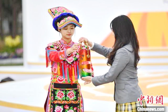 李伊琳(右)作为大学生代表交接火种灯