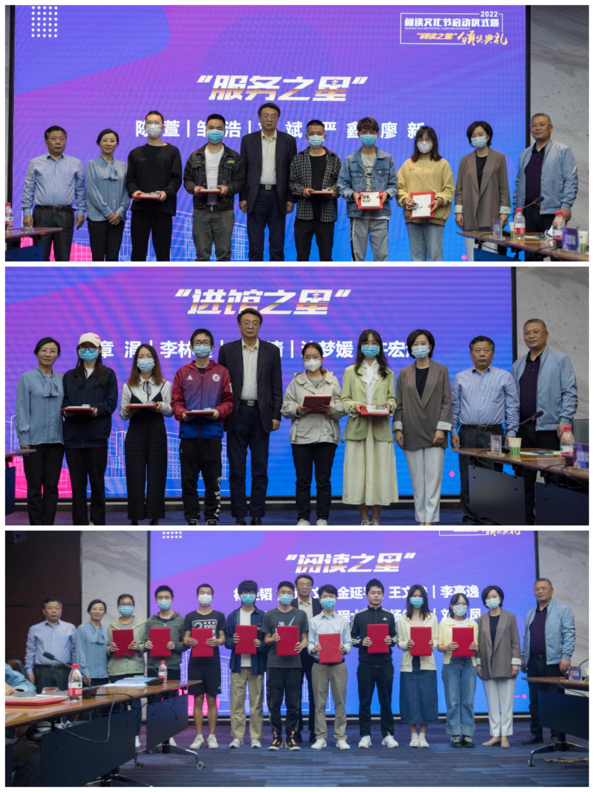 随后,举行了颁奖仪式。与会领导为获奖者颁发了证书及奖品。“进馆之星”是充分利用图书馆阅览与学习场所、在馆时长位居前列的读者;“服务之星”来自于图书馆学生志愿者服务团队的表现优异者;“阅读之星”是充分利用图书馆的馆藏资源、借阅图书量位居前列的读者。
