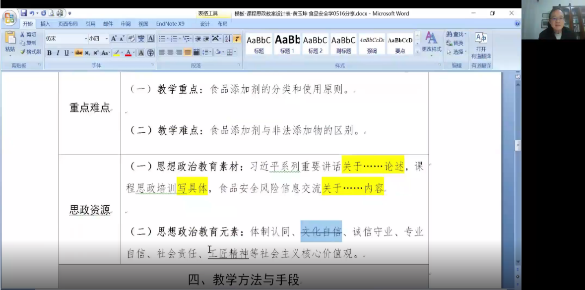 在交流分享环节,张教授重点就两位老师提交的教案进行模拟研讨,帮助教师明确在做组内研讨时可以从哪些方向、角度和内容去交流调整教案设计中的思政元素,并且能够通过互相研讨迸发新的设计角度和思路。老师们纷纷表示,本次工作坊既有理论的高度和深度,又有具体的实践操作,收获颇丰。通过本次培训,大家对“课程思政”有了更加系统、深入的理解,责任意识增强,思路逐渐明晰,设计课程思政教学方案的能力得到大幅提升,为后续开展课程思政工作打下扎实基础。