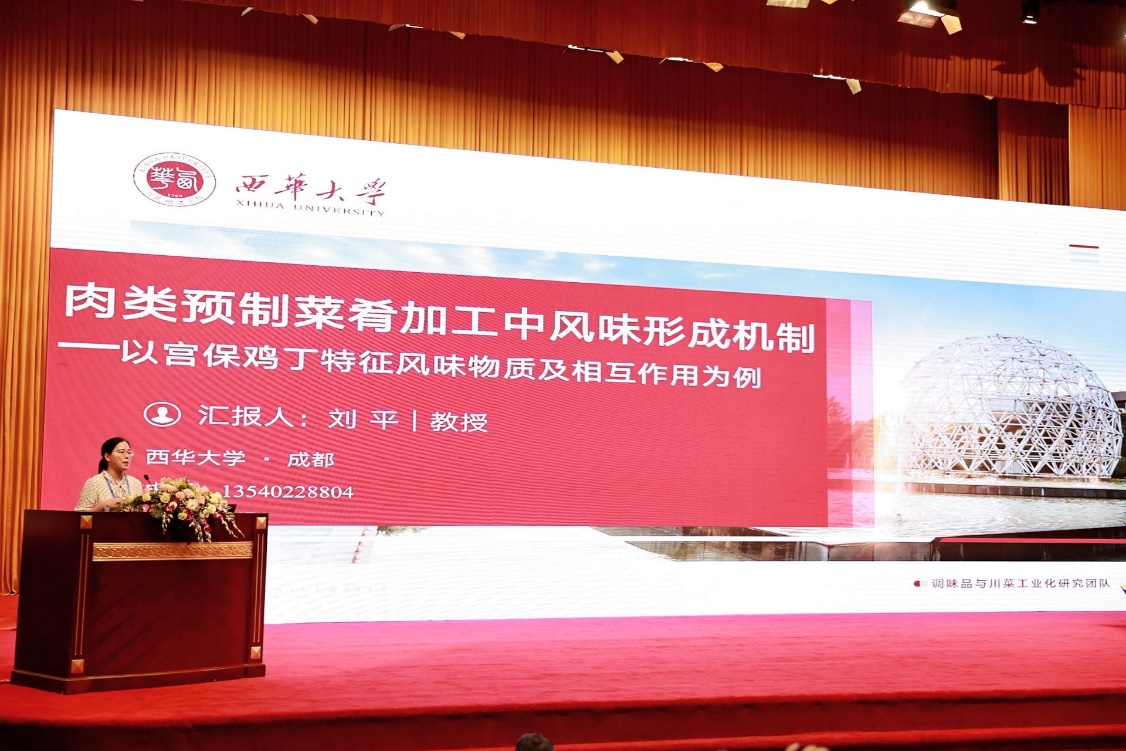 7月14日上午,大会在四川省微生物学会理事长孙群教授的主持下开幕。开幕式结束后,国家肉品质量安全控制工程技术研究中心主任周光宏教授、美国肯塔基大学熊幼翎教授等知名专家学者作了精彩报告。7月14日下午,我校食品与生物工程学院刘平教授在本次会议上作了题为“肉类预制菜肴加工中风味形成机制——以宫保鸡丁特征风味物质及相互作用为例”的报告,主要以预制菜的研究为背景,介绍了肉类预制菜肴加工过程中的风味形成机理,重点以宫保鸡丁为例,详细地向同行专家和学者介绍了肉类预制菜中特征风味物质的解析以及风味物质之间的相互作用,报告内容吸引了同行学者的广泛兴趣,受到一致好评。