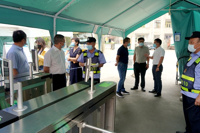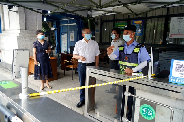 “同志们辛苦了!”来到南大门、西大门、西侧门等值守门岗,余孝其重点检查了校门口进出人员台账登记册和车辆进出管控流程,仔细查看了人员出入校园证件管理、扫码测温、登记信息等值班值守情况,仔细询问校门管控面临的主要困难。来到西华苑北苑东门,余孝其仔细查看了住户出入苑区的管理情况。他强调,校门是疫情防控外防输入的第一道防线,一定要严格执行学校疫情防控要求,严把校门关,筑牢校园疫情防控第一道“安全防火墙”;要进一步细化人员出入管理,所有人员要凭证出入,要做好外出人员行程登记,以便学校掌握基本情况,如有突发事件能快速应对、精准处置;值班党员干部要严格履职,配合安保人员做好校门管控工作,协调处置有关情况和问题;西华苑北苑东门要纳入学校门卫管理,加强管控,非学校疫情防控工作人员一律不得进出此门,确保校园安全稳定。