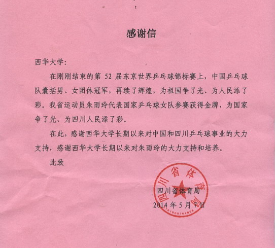 5月5日,2014年世乒赛团体锦标赛在东京落下帷幕,我校管理学院2012级人力资源管理专业学生朱雨玲作为中国乒乓球女团主力成员之一在比赛中表现非常出色,屡次力克强手,和队友一道以绝对的实力荣获冠军。近日,四川省体育局给我校发来感谢信,感谢学校对中国和四川乒乓球事业所作出的贡献。 对于四川省来讲,这是一个标志性的荣誉,这是四川省乒乓球建队以来第一次获得乒乓球女子团体世界冠军。对于学校来讲,这也是我校建校以来第一次获得乒乓球世界冠军,取得了历史性的突破。这更是我校与四川省体育局长期以来孜孜探索的“体教结合”运动员培养模式结出的丰硕成果。 “专项突出,均衡发展”是我校与四川省体育局就乒乓球高水平运动员培养的共同目标。长期以来,作为四川省唯一的高校高水平乒乓球项目的学校,我校与四川省体育局就新时期“体教结合”运动员培养模式的科学高效运作的体制和机制始终保持着密切交流并进行着不懈地实践探索。 到目前为止,四川省体育局共为我校输送乒乓球高水平运动员15人,各级赛事竞赛成绩非常优异。同时,在教练员流动、裁判员培训、大型赛事承办以及器材设备支持等领域,四川省体育局也给予我校高度地支持和帮助。 与此同时,我校也在不断深化运动员学籍管理、文化学习、第二课堂乃至就业等领域的改革力度,力求为高水平运动员的综合发展提供更好的环境氛围和政策支持。 四川省体育局的感谢信中表示:“我省运动员朱雨玲代表国家乒乓球女队参赛获得金牌,为国家争了光、为四川人民添了彩。在此,感谢西华大学长期以来对中国和四川乒乓球事业的大力支持,感谢西华大学长期以来对朱雨玲的大力支持和培养。” 附:我校乒乓球高水平运动员竞赛成绩 一、2008年7月,安徽黄山,第14届全国大学生乒乓球锦标赛: 1、女子单打第二名(聂维) 2、女子单打第三名(赵若珊) 3、男子单打第三名(刘劲) 二、2009年8月,内蒙古呼和浩特,第15届全国大学生乒乓球锦标赛: 1、甲组女子团体亚军(聂维、黄秋禹、赵若珊) 2、甲组女双亚军(聂维、黄秋禹) 3、甲组混双亚军(聂维、刘劲) 4、甲组男双季军(刘劲、蔡航) 三、2010年7月,四川成都,第16届全国大学生乒乓球锦标赛: 1、甲组女子团体 第一名(聂维、李茜、俞杨) 1、甲组男子双打 第二名(刘劲、蔡航) 1、甲组混合双打 第三名(俞杨、蔡航) 四、2011年7月,山东泰安,第17届全国大学生乒乓球锦标赛: 1、甲组女子团体 第二名(聂维、黄秋禹、俞杨) 五、2013年,我校2012级乒乓球高水平运动员朱雨玲国际赛事成绩: 1、2013年巴黎世界乒乓球锦标赛,女子双打,第三名。(朱雨玲) 2、2013年巴黎世界乒乓球锦标赛,女子单打,第三名。(朱雨玲) 3、2013年东亚运动会,女子双打,第一名。(朱雨玲) 4、2013年东亚运动会,女子单打,第二名。(朱雨玲)