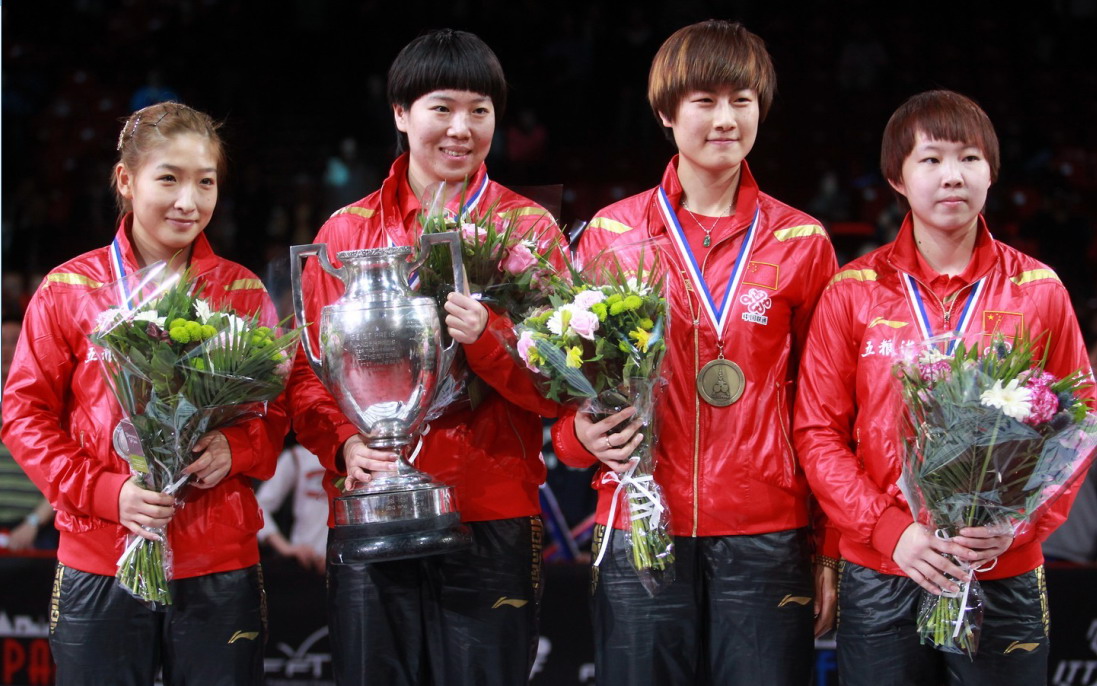 朱雨玲(右一)与她的队友在领奖台上 |