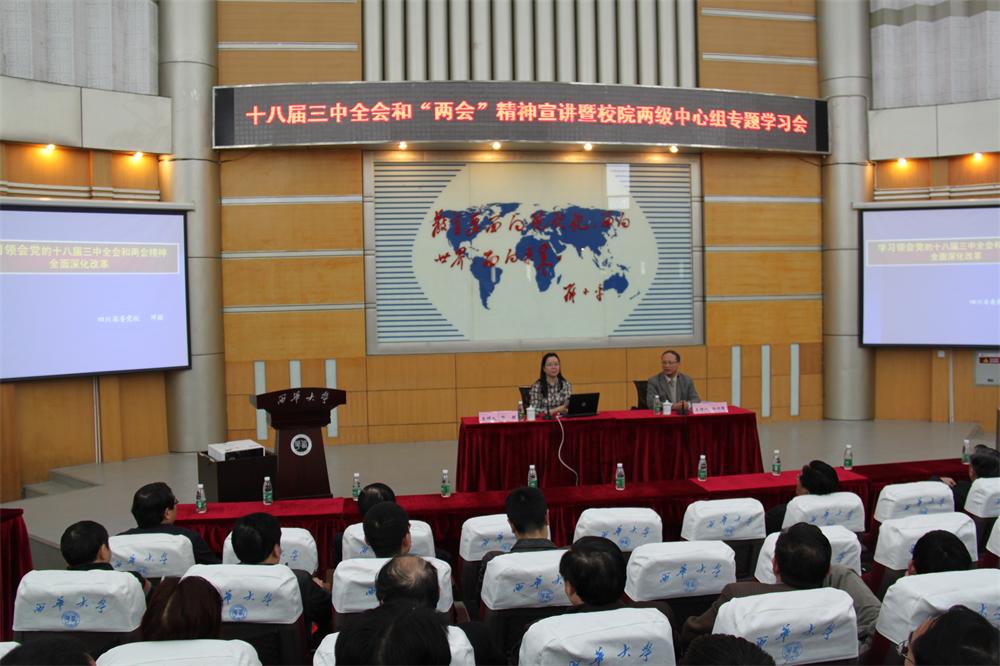 4月4日下午,四川省委党校、四川行政学院教务处处长邓颖应邀为我校师生作了一场题为《学习贯彻十八届三中全会和“两会”精神,深化体制改革》的专题宣讲。学校领导,副处及以上中层领导干部,校院两级中心组成员,各学院学工办主任、团委书记、专职辅导员,政治学院全体教师和学生代表聆听了报告。校长孙卫国主持宣讲会。 “在全面深化改革的历史大背景中,如何准确把握经济体制改革的问题?”邓颖强调,要能准确把握这个问题,就必须要从三个维度去把握,一是要从新中国发展的历史进程去领会和把握全面深化改革的重大意义,二是要从中国走向大国的时代背景与问题倒逼的角度去把握全面深化改革的重点,三是要从推进国家治理体系和治理能力现代化的总目标去领会和把握全面深化改革的重大举措。 围绕全面深化经济体制改革的几个重要方面的问题,邓颖围绕发展结构、发展动力、发展机制和治理模式等几个重要方面的问题展开阐释,并从正确处理好政府和市场的关系、中央和地方的关系等基本命题入手,针对当前改革过程中存在的主要问题,结合三中全会精神和两会精神,就全面深化改革作了详细解读。 “十八届三中全会是中国发展的重要拐点。但中国社会如同一辆急速行驶的超重大货车,经济的快速发展、社会的快速分化、矛盾的快速积累就是其急速的动力。在这样的情况下,见到了拐点也不能猛打方向盘,而是需要高超的驾驶技术。” 邓颖用此语结束了本次宣讲。 本次专题宣讲主题鲜明、逻辑清晰、层次分明、引经据典、阐释深刻,让在场师生产生了强烈的共鸣。正如孙校长在总结讲话中所说,“这是一场很有质量、很有深度、很有内涵的报告,通过专题辅导,我们对全面深化改革的认识更加深刻,对全面深化改革的方向更加明确,对全面深化改革的信心更加坚定,对全面深化改革的路径更加清晰,相信美丽的中国梦一定会实现。” 本次报告,既是学校组织的学习贯彻党的十八届三中全会和“两会”精神的一次报告会,也是校院两级党委中心组的一次学习会。此前,学校党委就学习贯彻党的十八届三中全会和“两会”精神作出了统一部署,并先后邀请校内外专家作专题辅导报告,帮助师生深入学习和把握三中全会和“两会”精神。2013年12月13日下午,省委宣讲团成员、四川大学马克思主义学院党委书记高中伟教授在四教报告厅为我校师生作了一场学习贯彻党的十八届三中全会精神专题报告。