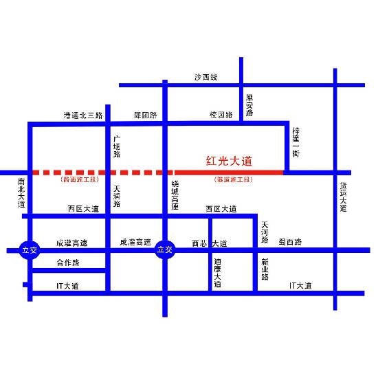 附:公交线路调整公告 一、新开行2条线路 (1)717路,起讫点及走向:郫县客运中心、东西大街、双柏路、317国道、犀浦公交站。 返程:犀浦公交站、317国道、兴业南街、西区大道、南北大道、东西大街、郫县客运中心。 沿途站点仅停靠:郫县客运中心站、西外街站、西大街站、东大街站、三九八厂站、时代花城站、郫县人民政府第一办公区站、红光镇站(返程:西区大道迪康大道口站、红合路口站)、犀浦公交站。 收发车时间:郫县客运中心:6:00—22:30,犀浦公交站:7:00—23:30. (2)333路,起讫点及走向:西郡英华站(始发)、幸福路、正兴大道、广场路、317国道、犀浦镇、西区花园、百草路、天目路、羊犀线、蜀汉路、蜀光路、蜀兴西街、蜀蓉路公交站。 返程:蜀蓉路公交站、蜀汉路、羊犀线、天目路、百草路、犀浦镇、泰山大道、西区大道、红高路、广场路、正兴大道、幸福路、西郡英华。 收发车时间:西郡英华站:6:00—21:00,蜀蓉路公交站:6:30—21:30。 二、调整14条线路 (1)305路,线路调整为不再绕行犀浦镇,往金沙公交站方向线路的车辆行驶至西区大道泰山大道口沿西区大道直行至迪康大道后回到原线路行驶,往返一致。 (2)720路,往犀浦方向线路由郫县客运中心始发改走望丛中路至西区大道后回到原线路行驶,往返一致;往郫县方向线路改走由犀浦公交站始发途经317国道右转至兴业南街、浦兴街、珠江路、泰山大道后回到原线路行驶。 (3)721路,往犀浦方向走向不变;往德源方向线路改走由犀浦公交站始发途经317国道右转至兴业南街、西区大道后回到原线路行驶。 (4)722路,线路不再由犀浦公交站始发,终点站改至天府路南站,古城方向终点站向北延伸至指路村。往返一致。 (5)707路,线路不再由犀浦公交站始发,终点站改至天府路南站。调整路段:线路由徐独路直行至红光路,途经红佳路后回到原线路行驶,往返一致。 (6)708路,往犀浦方向走向不变;往合信路方向线路改走由犀浦公交站始发途经317国道右转至兴业南街、犀围城路、迪康大道回到原线路行驶。 (7)321路,变更线路番号为715路,线路不再前往犀浦公交站,终点站改至工业港公交站。即线路由工业港公交站始发途经徐独路、红光路、红佳路后回到原线路行驶,往返一致。 (8)740路,往犀浦方向走向不变;往平乐寺(界牌)方向线路改走由犀浦公交站始发途经317国道右转至兴业南街、西区大道、红光右支、317国道后回到原线路行驶。 (9)320路,往茶店子方向走向不变;往郫县方向线路改为车辆行驶至成灌路梓潼一街口后右转至梓潼一街、校园路、天府路、校园路、犀团路、徐独路、广场路、317国道后回到原线路行驶。 (10)310路,往团结方向线路改为车辆行驶至成灌路梓潼一街口后右转至梓潼一街、校园路、犀团路后回到原线路行驶,往返一致。 (11)704路,往雍渡村方向线路改为车辆行驶至成灌路兴业北街口后左转至兴业北街、校园路、犀安路后回到原线路行驶;往郫县方向线路改为由犀安路校园路口右转至校园路、天府路、校园路、犀团路、徐独路、广场路、317国道后回到原线路行驶。 (12)323路,往茶店子公交站方向不变;往西郡英华方向改为车辆行驶至成灌路梓潼一街口后右转至梓潼一街、校园路、犀团路、徐独路、红光路后回到原线路行驶。 (13)711路,往犀浦方向线路不变;往郫县方向线路改为由犀浦公交站始发途经317国道右转至兴业南街、西区大道、天润路后回到原线路行驶。 (14)326路,往高新西区公交站方向线路不变;往工业港公交站方向线路改为车辆行驶至珠江路口后左转至泰山大道、西区大道、红高路、广场路后回到原线路行驶。 三、停运3条线路 (1)723路,线路停运,前往红光、郫县的乘客可选择乘坐360路,前往犀浦、成都中心城区的乘客可选择乘坐310路。 (2)730路,因道路限制,暂停营运。 (3)323A路,线路停运,前往成都中心城区的乘客可选择乘坐333路。  下穿隧道工程效果图 红光大道路面效果图 红光大道交通疏导示意图 |