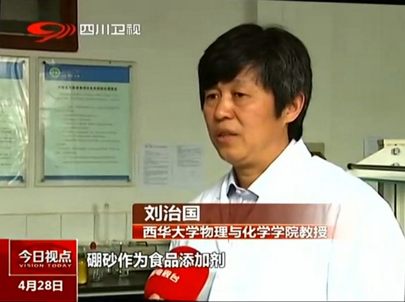 近日,我校物理与化学学院化学系刘治国教授带领学生进行了在食品中添加化学物质硼砂的实验,并在4月28日四川卫视《今日视点》节目 “硼砂事件”追踪新闻播出。 链接如下:http://v.youku.com/v_show/id_XNzA1MDE2MzEy.html