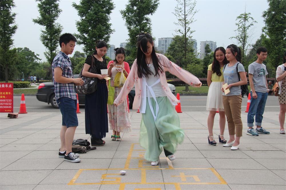 民俗游园会上学生穿古装玩“跳房子” 汉服表演