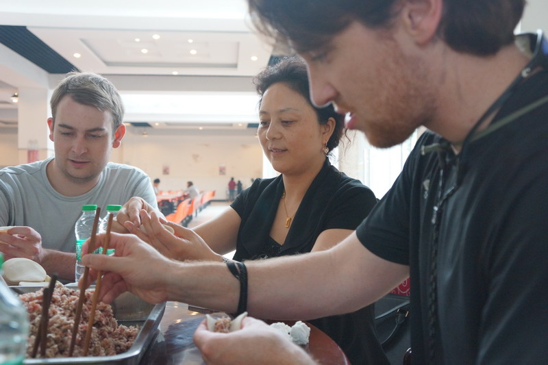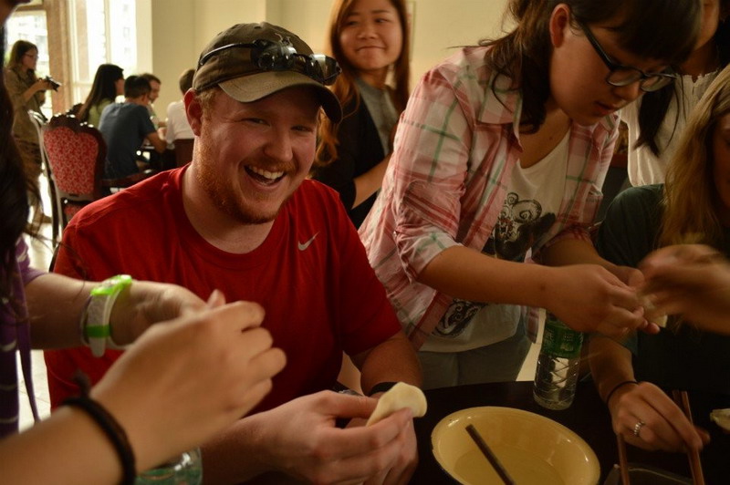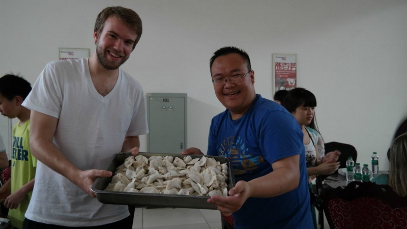 5月17日,来自美国阿拉巴马大学的13位大学生抵达我校,正式开始他们为期一个多月的汉语学习和中国文化体验活动。这13位同学分别来自工业工程、化学工程、金融学、会计学、营养学、运动科学等不同专业,但都对汉语和中国文化深感兴趣,因此利用美国暑期时间前来我校学习汉语,与我校学生开展文化交流活动,走近并体验中国本土生活,从而提升汉语水平,亲身接触并了解当今的中国文化与社会。 5月17日下午5:30,我校学子与美国阿拉巴马大学来访学生团相聚学生第四食堂,开展了具有中国传统文化特色的“包饺子”活动。本次活动由国际合作与交流处主办、人文学院承办。当天下午,学校为该学生团的来访举行了隆重的欢迎仪式。学校教职工接待家庭教师及子女、校国际合作与交流处负责老师、人文学院辅导员晏乔和来自各学院的8名学生英语志愿者参加了本次活动。 通过示范,来访团的同学们很快领略到了包饺子的方法,个个跃跃欲试,饶有兴致地动起手来。在同学们的帮助下,他们细心地将肉馅放入饺子皮中,蘸水、对折、拿折儿、压实。虽然是第一次包饺子,但他们做出的饺子有模有样,不仅有形状规整的饺子,还有充分发挥想象力“创作”出来形态各异的饺子,如“飞碟”、“草帽”、“花朵”、“鱼”等,这些饺子引得大家开怀大笑,整个过程气氛融洽,欢声笑语不断。 很快,一盘盘的饺子制作完毕。在大家等饺子出锅的间隙,来自2013级汉语国际教育的两名同学为大家带来了传统民乐表演,分别表演了《茉莉花》和《青春舞曲》两首歌曲。笛声刚落,热腾腾的饺子端上桌来。美国友人纷纷拿起筷子品尝,传统中国风味给他们带来了不一样的味觉感受,自己亲身经历了制作过程后的美味更是让他们印象深刻。