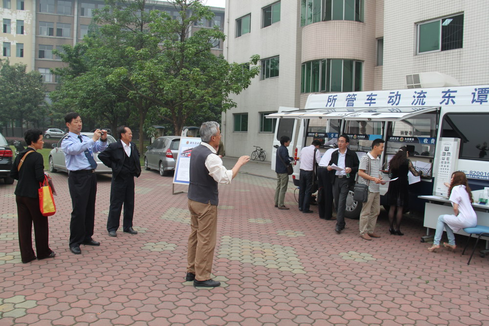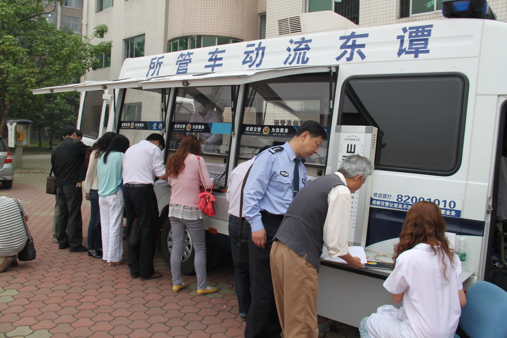 5月8日,成都市公安局交管局车管所 “谭东流动车管所”走进我校,在三教求是广场现场为广大师生办理各项车管业务,方便、快捷、优质、实惠的服务受到师生的好评。现场享受了“一站式”便捷服务的我校经济与贸易学院曾建民老师连声称赞:“车管所的贴心服务模式真是省时省事又省心,太方便了。过去我换一个证,要花大半天时间,排队、体检、再去车管所排队,很费时。” 上午8:30,“谭东流动车管所”的工作人员在王晋警官的带领下,一大早便来到三教求是广场,布置工作场地及安装相关设施。短短的十分钟内,一个可以同时容纳十余名用户办理业务的流动工作平台搭建起来了。早已闻讯赶来的我校广大师生纷纷走向服务台前的各个窗口,咨询办理相关业务。 为便于师生办理车管业务,“谭东流动车管所”服务车还随车配备医务人员,对办理驾驶证业务需提交《机动车驾驶人身体条件证明》的人员免费提供体检服务,出具身体条件证明。 据介绍,为了给群众提供全方位、零距离的优质车管服务,四川省成都市公安交通管理局车管所推出了流动式服务平台系统———“谭东流动车管所”,现场的服务项目有机动车业务、驾驶证业务、交通违法信息查询等三大项(包括十六小项),基本覆盖车管所的所有业务。 本次活动中,“流动车管所”共为我校师生办理各类车管业务28人次。 相关链接: 2008年12月29日晚,成都大邑县公安局交警大队事故预防处理中队西岭执勤组民警谭东,在奋不顾身跳下河渠中救出一名落水司机后,不顾自己身患重感冒,仍然带病坚守岗位。连续工作,积劳成疾,于2009年1月5日晚昏倒在工作岗位上,经抢救无效去世,年仅45岁。谭东同志牺牲后,中央及省领导分别批示,号召公安民警及党员干部向谭东同志学习。成都市交管局车辆管理所将流动车管所命名为“谭东流动车管所”,就是要把谭东全身心为老百姓办实事、办好事的精神融入到车管所工作中去。 “谭东流动车管所”这种流动式业务服务模式属全国首创,通过此举,可以让广大群众在家门口就能办理车驾管业务。此举同时将车管工作从静态管理转变为动态管理,使车管服务覆盖至成都的每一个角落。