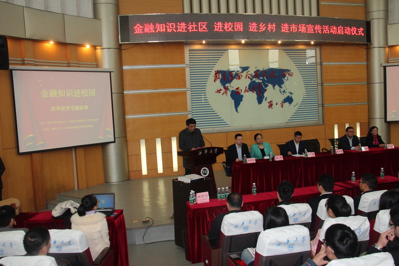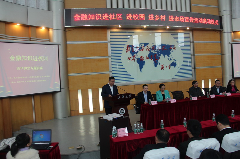 3月13日上午10时,由中国人民银行成都分行、四川省青年联合会主办,中国人民银行成都分行营管部、西华大学协办,中国人民银行郫县支行、中国工商银行郫县支行承办的“3.15金融知识进社区、进校园、进乡村、进市场”宣传活动启动仪式在我校四教报告厅隆重举行。此举拉开了金融知识“进社区、进校园、进乡村、进市场”宣讲活动的序幕。 本次活动的主题是为普及金融知识、提高公众的金融风险防范意识、保护金融消费者权益,弘扬志愿服务精神。共青团四川省委副书记、省青联主席张荣,人民银行成都分行党委委员、工会主任岑岺,四川银监局党委委员、副局长、省青联副主席谢涛,人民银行成都分行营业管理部党委委员、纪委书记田蓓,成都农商银行副行长、省青联金融界别主任王万峰与我校党委副书记王小林出席活动启动仪式。人民银行成都分行和四川银监局有关部门负责人,部分省青联委员、央行志愿者代表,校团委、经济学院主要负责人以及我校师生代表参加了此次活动。启动仪式由校团委主持工作副书记王唯洁主持。 王小林在致辞中代表学校对各位领导、各位来宾的到来表示热烈欢迎。他强调,科技金融是现代经济的核心,开展“金融知识进校园”专题讲座意义重大,它与大学生的日常生活密切相关,希望同学们加强对金融的理解和认识,消除对金融风险的误区,并将所知所悟运用到日常生活和学习中。 共青团四川省委副书记、省青联主席张荣,四川银监局党委委员、副局长、省青联副主席谢涛,人民银行成都分行党委委员、工会主任岑岺分别作了讲话。金融是国民经济的命脉,掌握必要的金融知识意义重大,希望同学们能积极投身公益事业,不断创新,努力为全省推进“四个全面”做出更大的贡献。 启动仪式后,人民银行成都分行的两位青年志愿者杨宇焰博士和冉智泉老师在现场分别就互联网金融发展、征信等相关金融知识作了专题讲授。 人民银行成都分行金融研究处副处长、四川省家金融学会副秘书长、高级经济师杨宇焰博士以《互联网金融发展研究》为题,从信息技术发展历程及其对金融业的影响,基于网络技术的新型金融发展、风险与趋势、现代金融信息技术下的宏观调控、金融监管,网络金融给民法基本制度带来的挑战及建议这四个方面为大家讲解了金融的相关知识。 随后,人民银行成都分行征信管理处综合科科长冉智泉老师以《征信,在我们身边》为题作了讲授。他详细讲解了什么是征信、征信的影响、怎样参与征信,在征信活动中有什么权利等问题。 最后,工商银行四川省分行电子银行专家张佳佳女士为同学们作了银行卡应用实务操作方面的介绍,并与现场同学们热情互动。人文学院2012级李静同学表示,这次讲座具有很强的实用性,作为当代大学生,学好、用好金融知识,锻炼自己积累和增加财富的能力、保护好自身的金融权益,具有十分重要的现实意义。